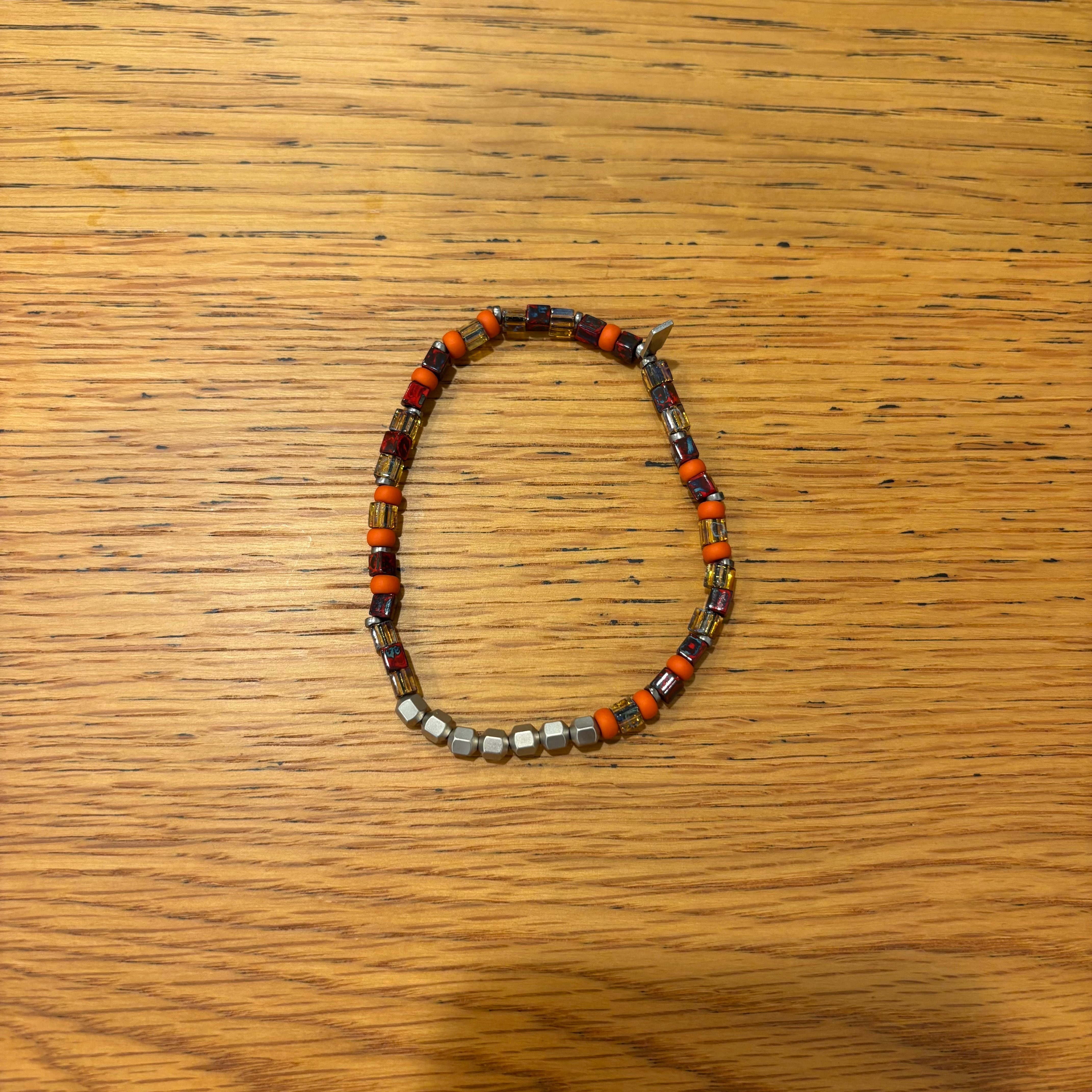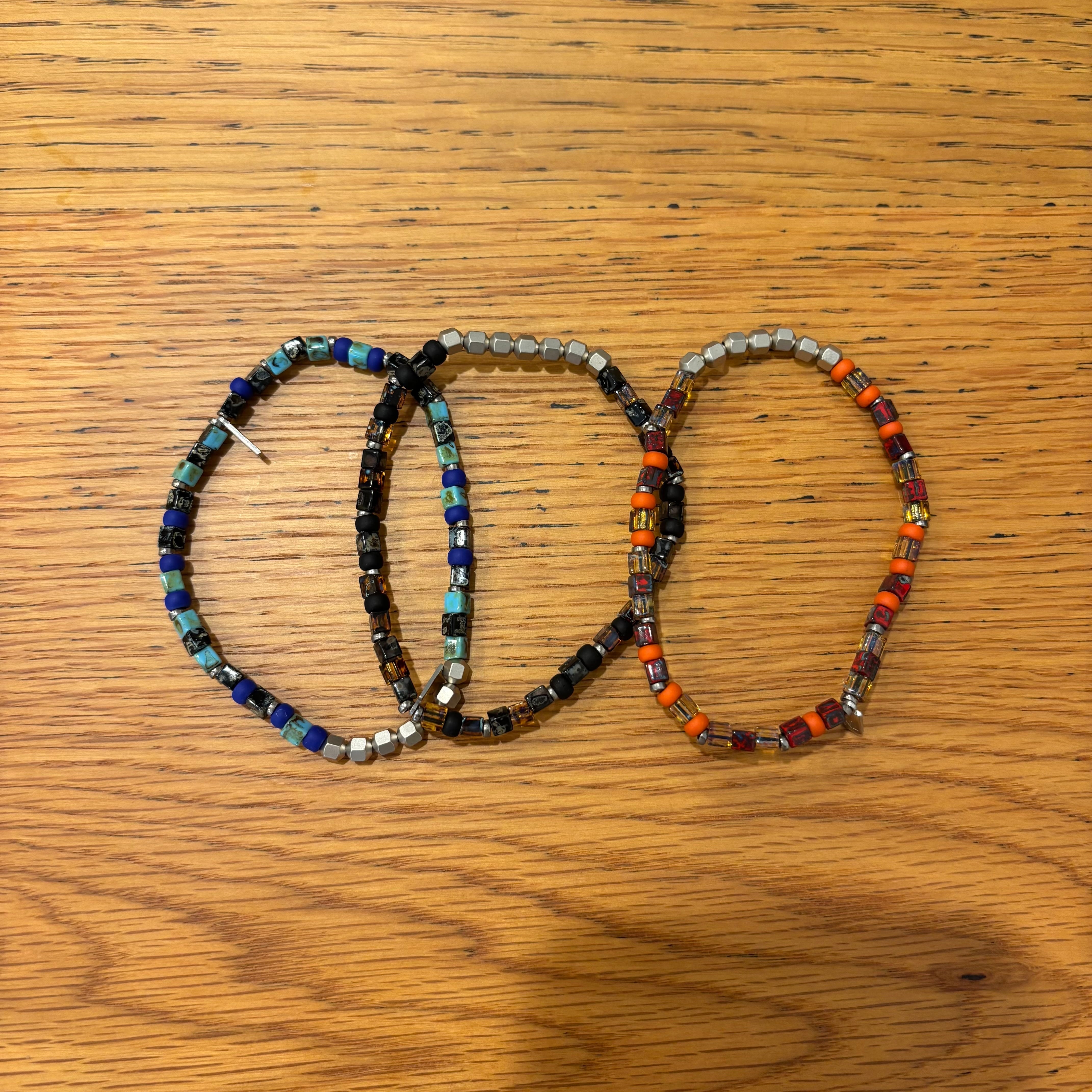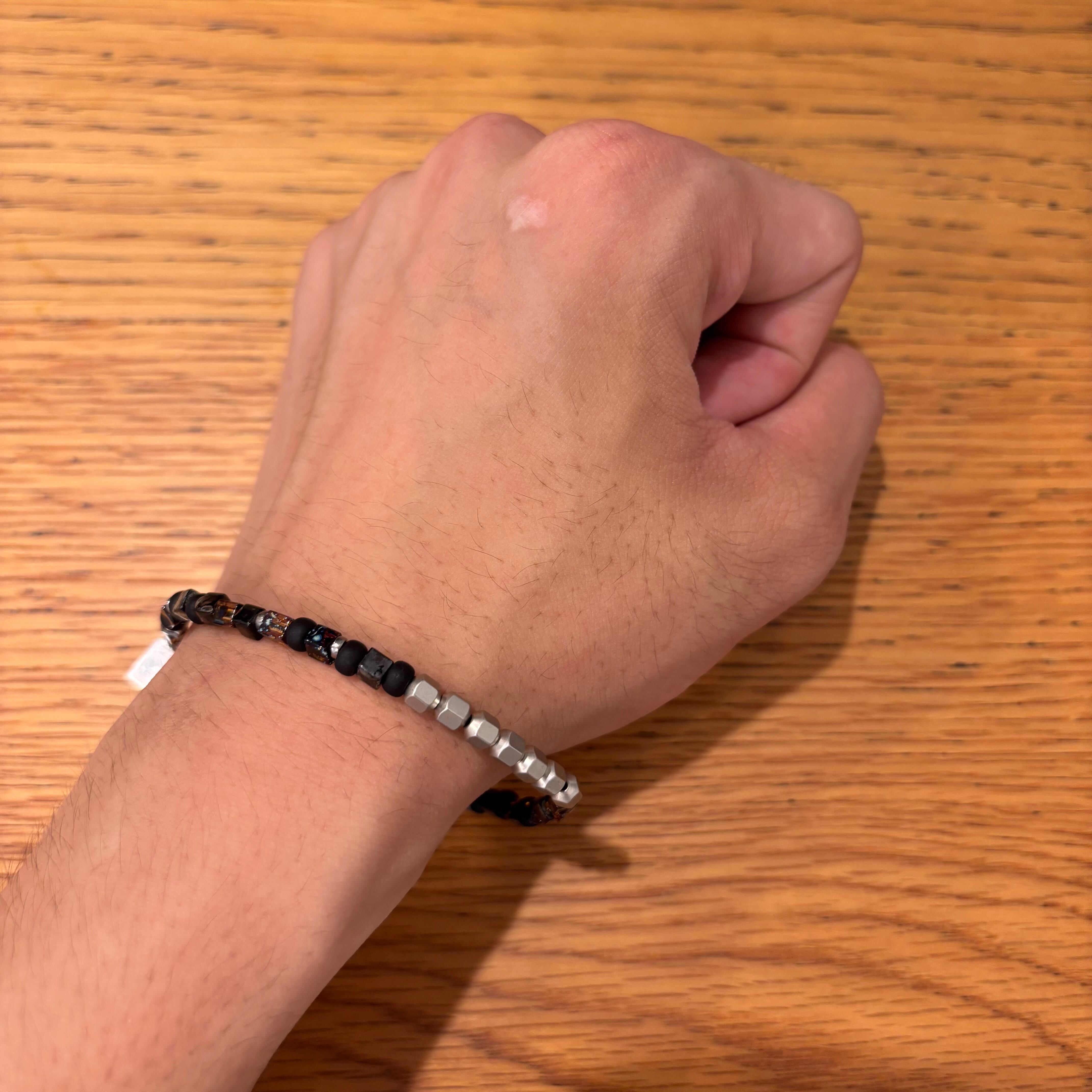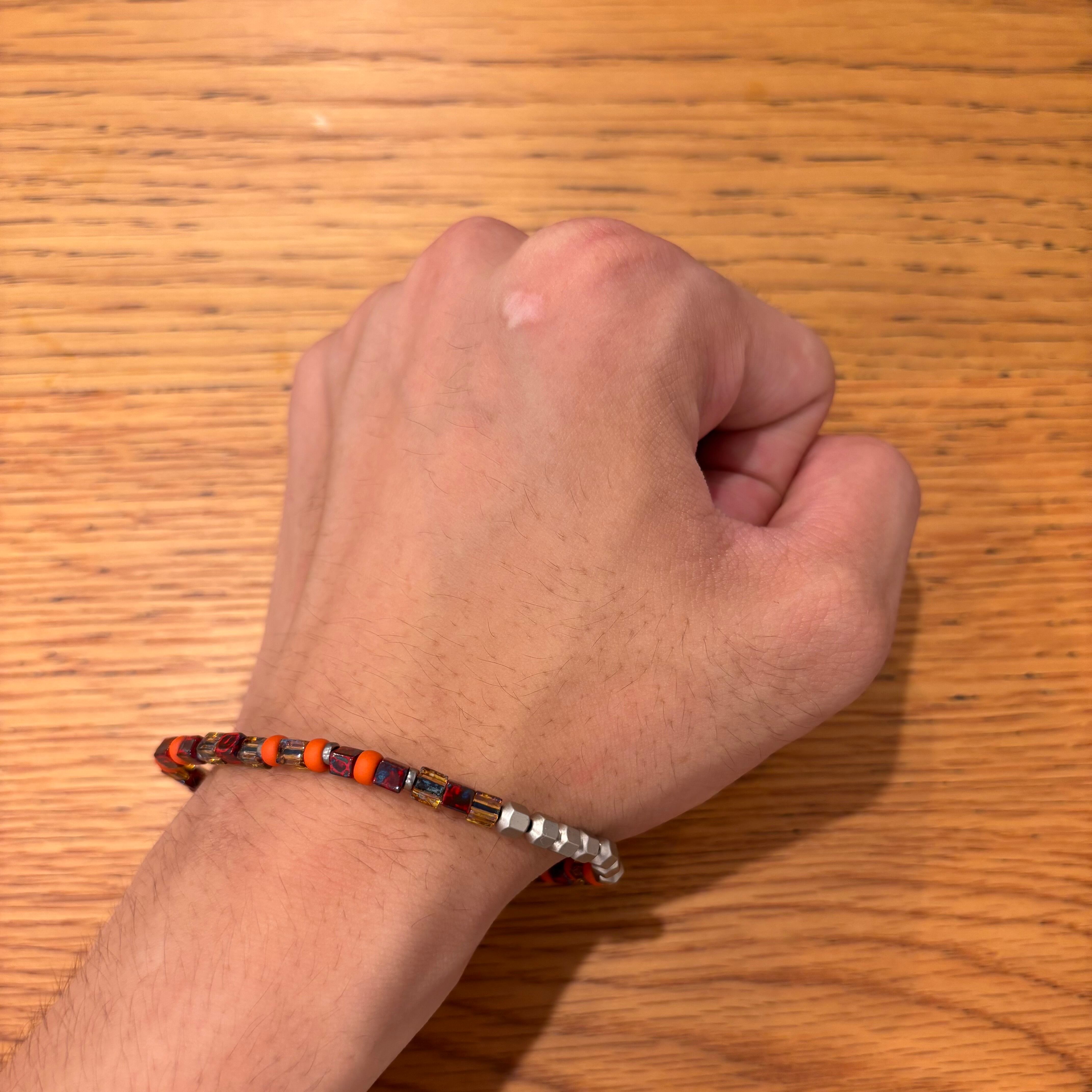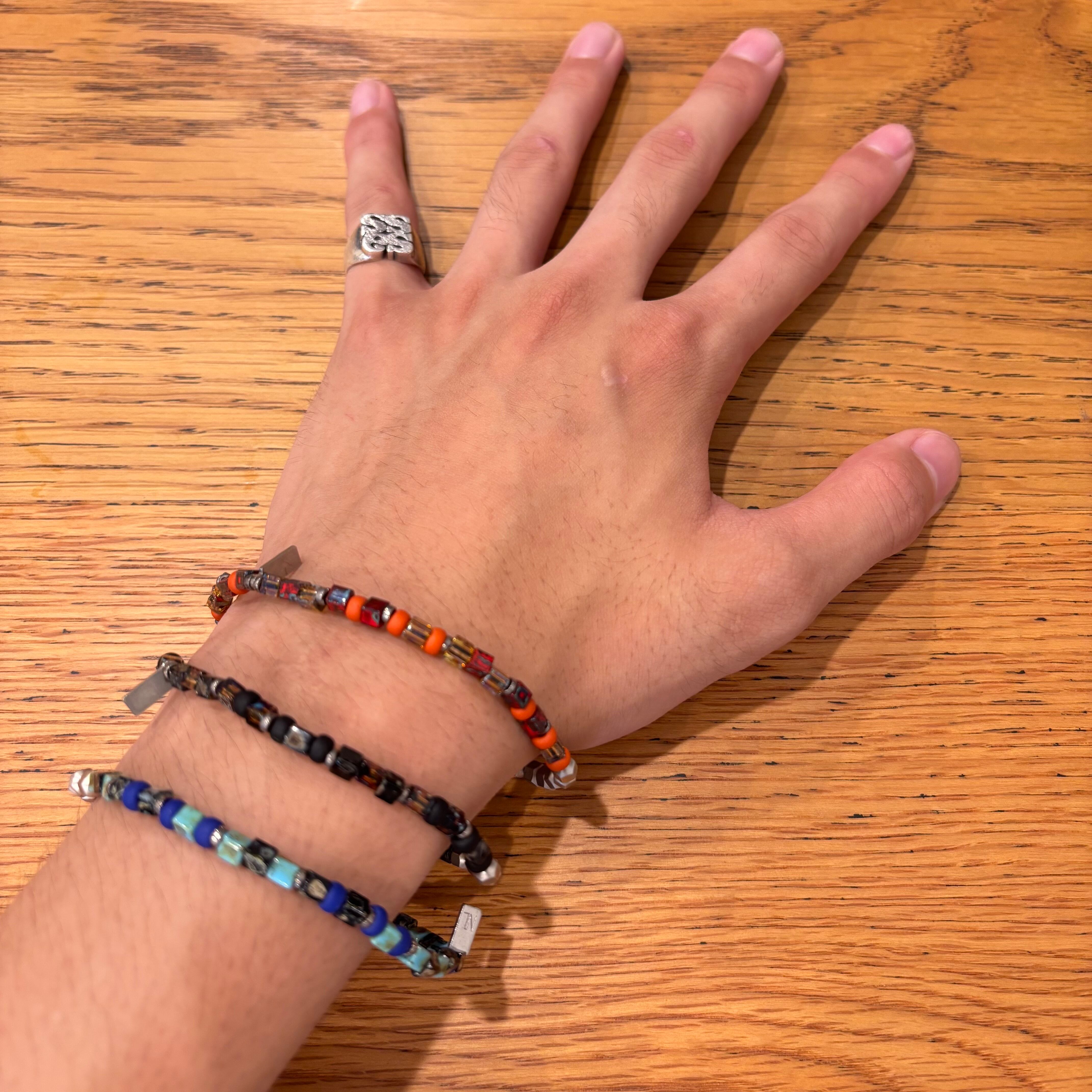 伸縮性のあるテグスを使っているので、着脱もスムーズです。別デザインのブレスレットとも重ね付けもしやすいデザインで重宝します。
