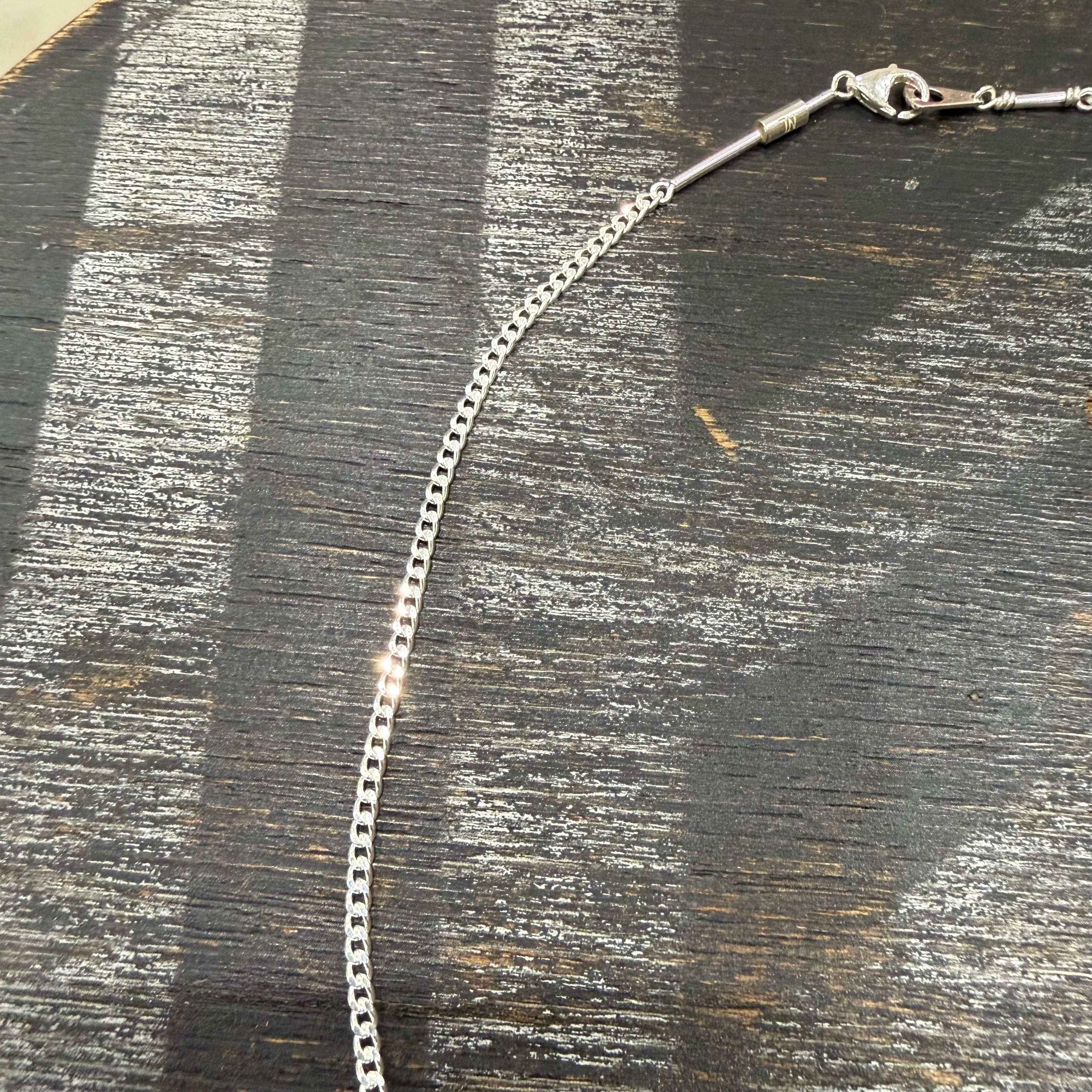 小さく細かい喜平のチェーン。留め具のシルバーバーの片側だけ長くなっており、NL刻印が入ったパイプが通っております。長いシルバーバーを前につけたりすることで日々のファッションに変化を用いることができます。