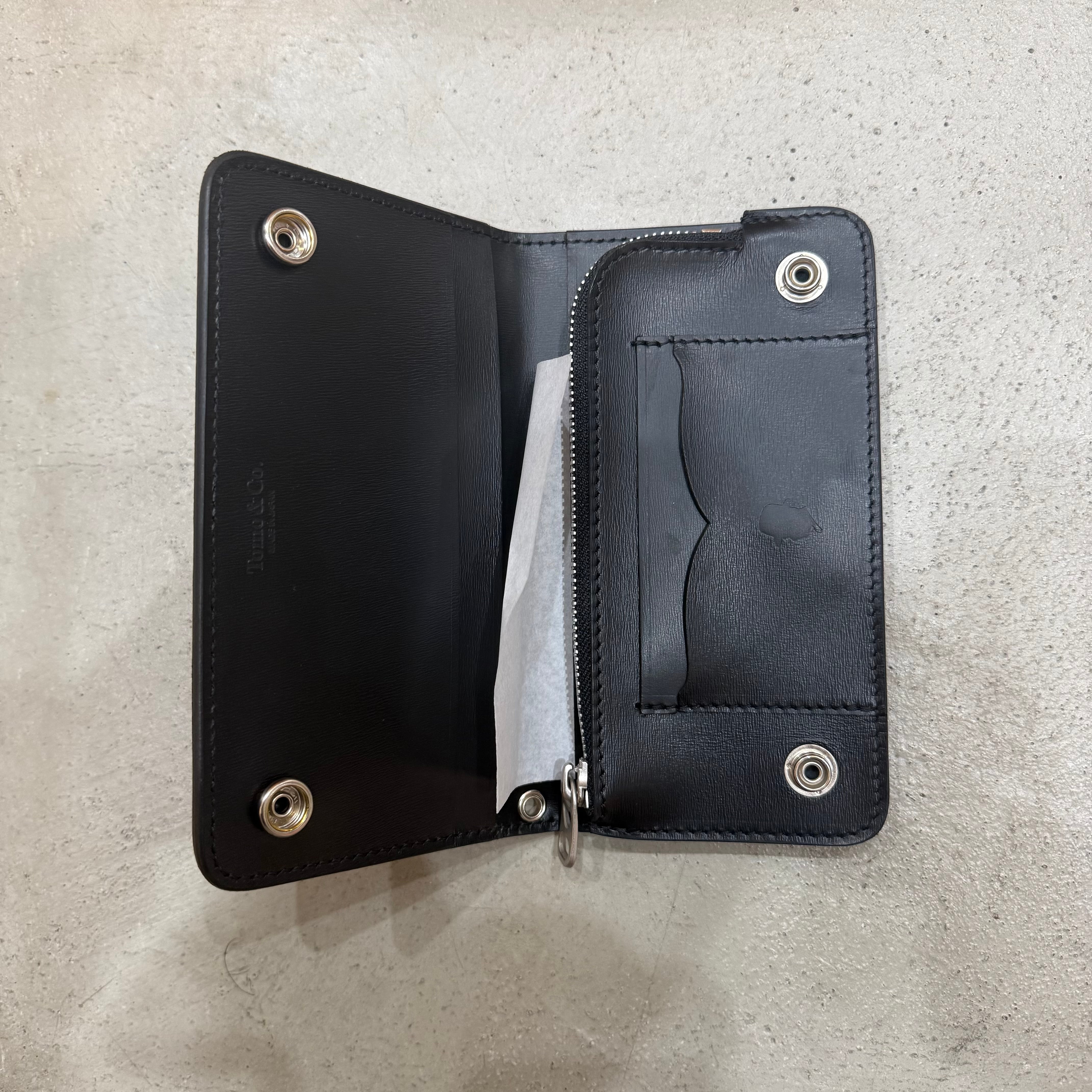 ガラスレザーのような表情のフランス原皮のカフレザーを使用したバイカーウォレットになります。とても頑丈に作られた一品です。