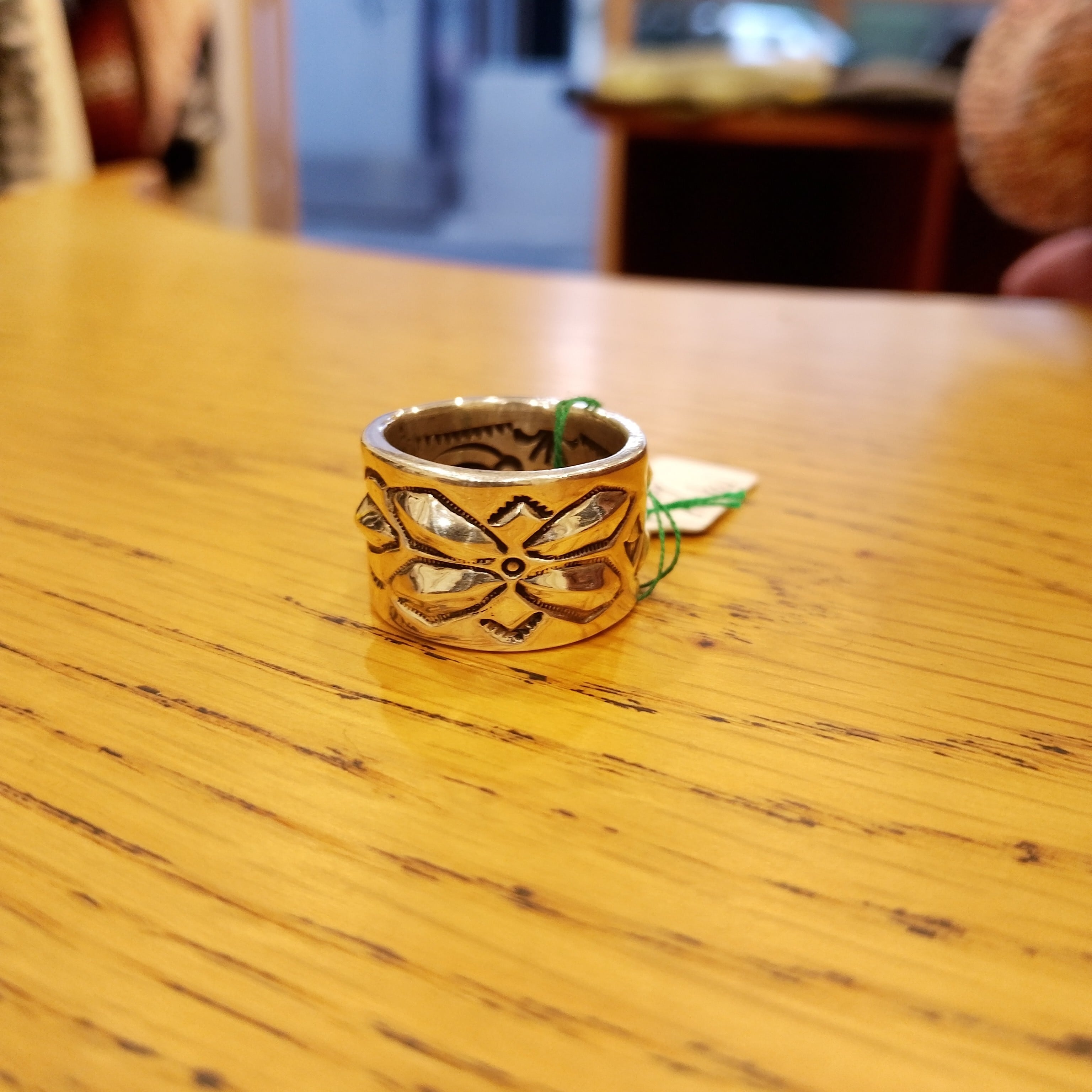 ナバホ族Ray・Adakai制作のリングになります。表面は叩き出しのリボウズスタンプでデザインされています。
